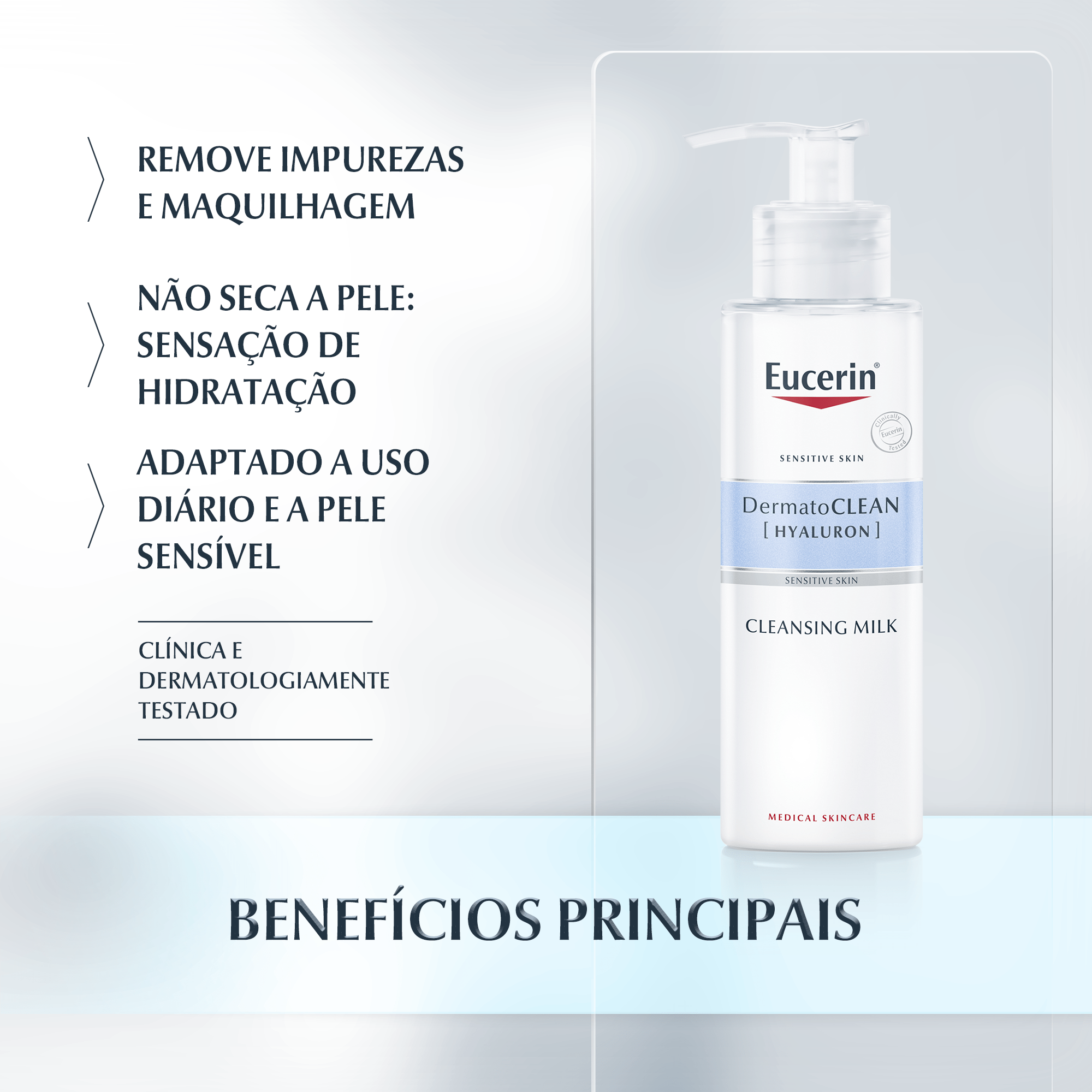 Eucerin DermatoCLEAN Emulsão de Limpeza Suave é uma loção cremosa que limpa suavemente a pele e remove as impurezas e maquilhagem com o seu complexo APG.