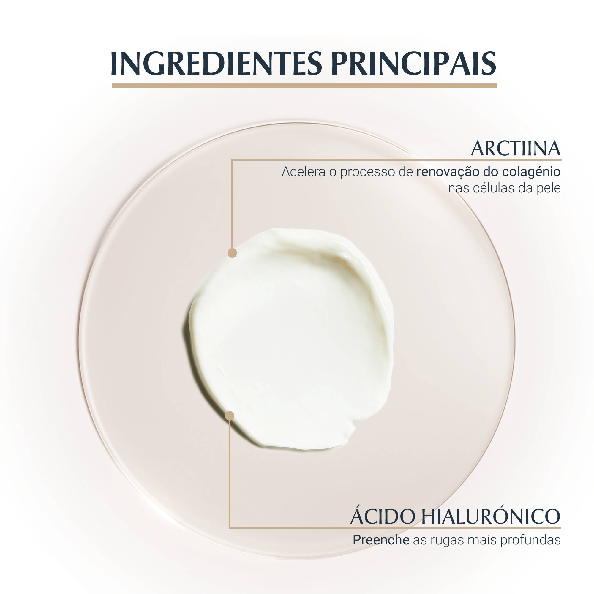 Preenche as rugas mais profundas através do ácido hialurónico. Ao mesmo tempo promove a produção natural de colagénio conferindo firmeza e elasticidade, bem como potenciando a luminosidade da pele, graças à Arctiina.
