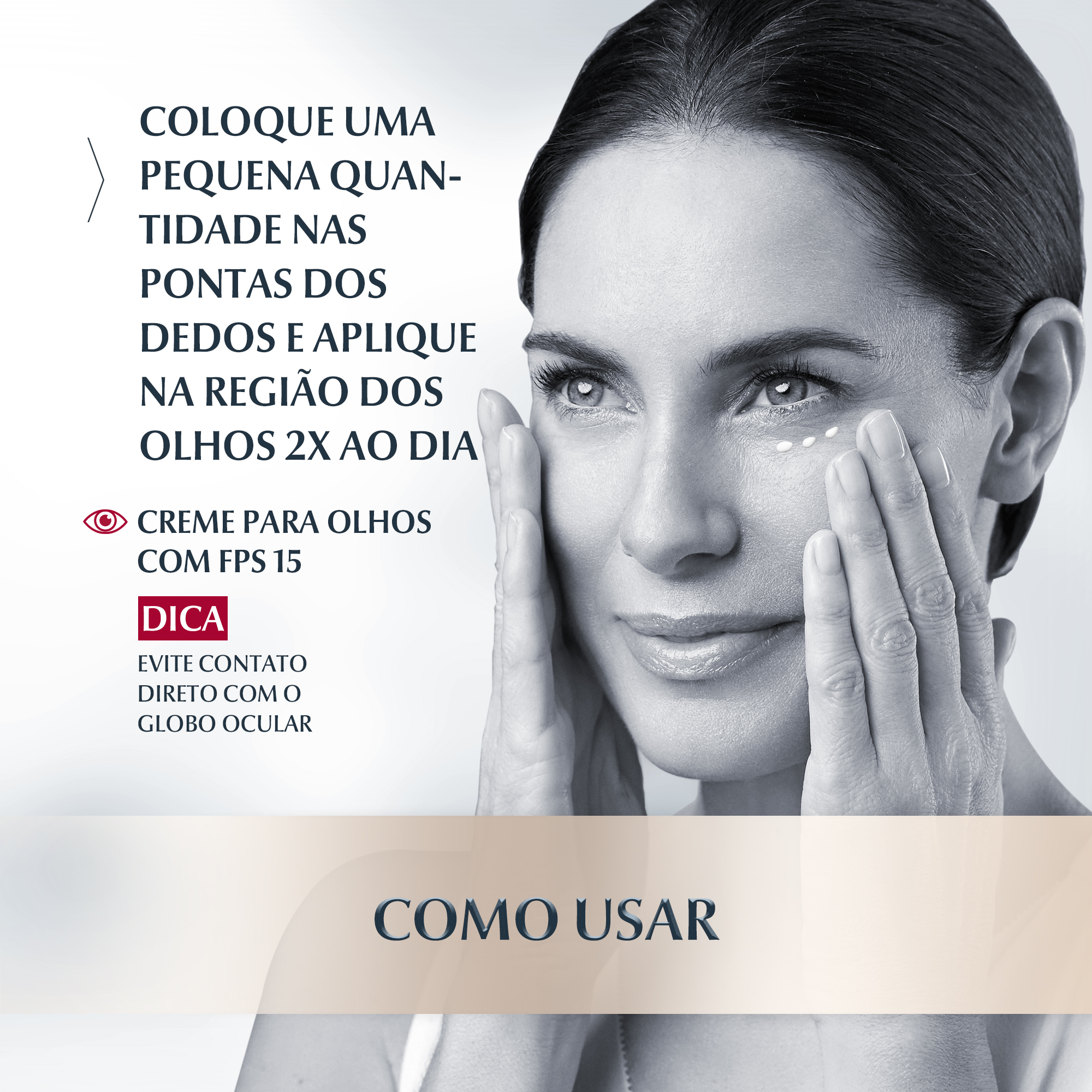 O creme de olhos também contém filtro FPS 15 e UVA para uma proteção acrescida contra raios que possam aprofundar as rugas e acelerar o processo de envelhecimento da pele.