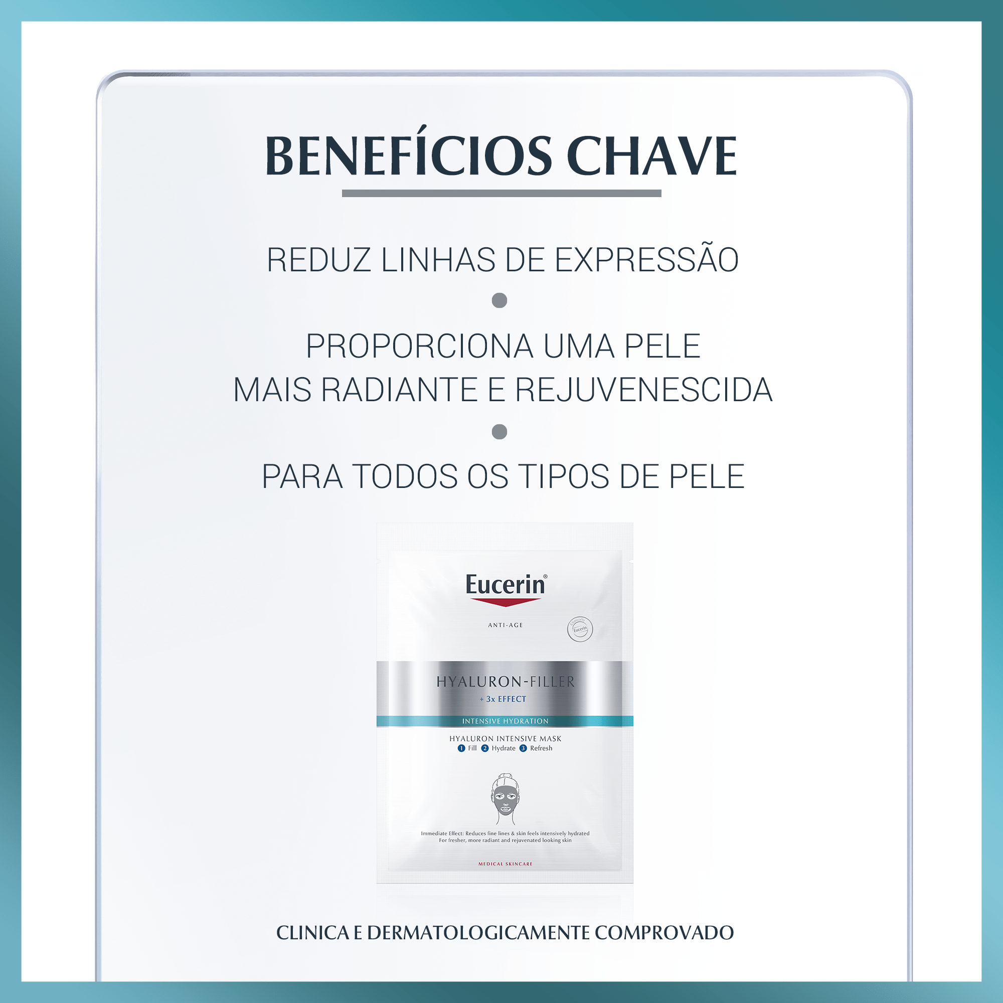 Impregnada com a mistura da Eucerin de Ácido Hialurónico de alto e baixo peso molecular melhora a hidratação e suaviza as rídulas nas camadas mais externas da pele, enquanto penetra nas camadas mais profundas da epiderme onde as rugas mais profundas têm origem.
