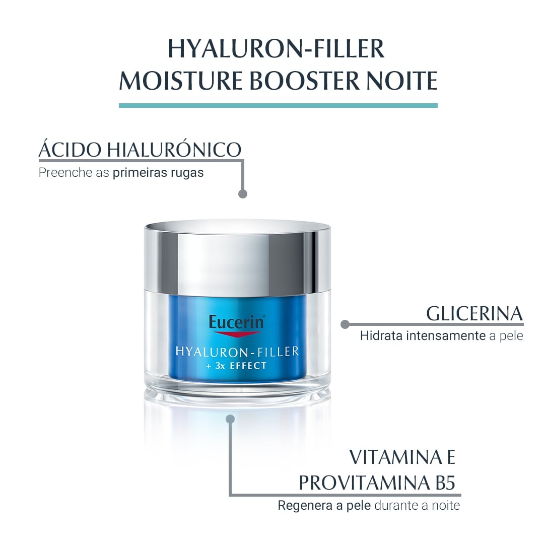Eucerin Hyaluron-Filler x3 Effect Moisture Booster Noite é um cuidado de noite hidratante ultraleve para as primeiras rugas.