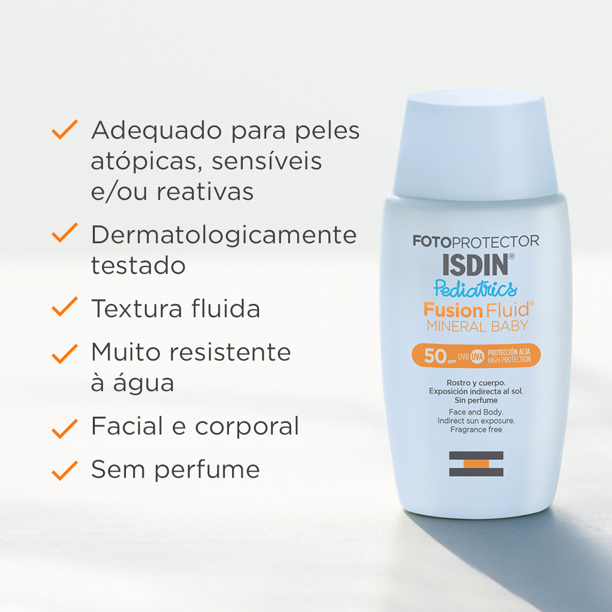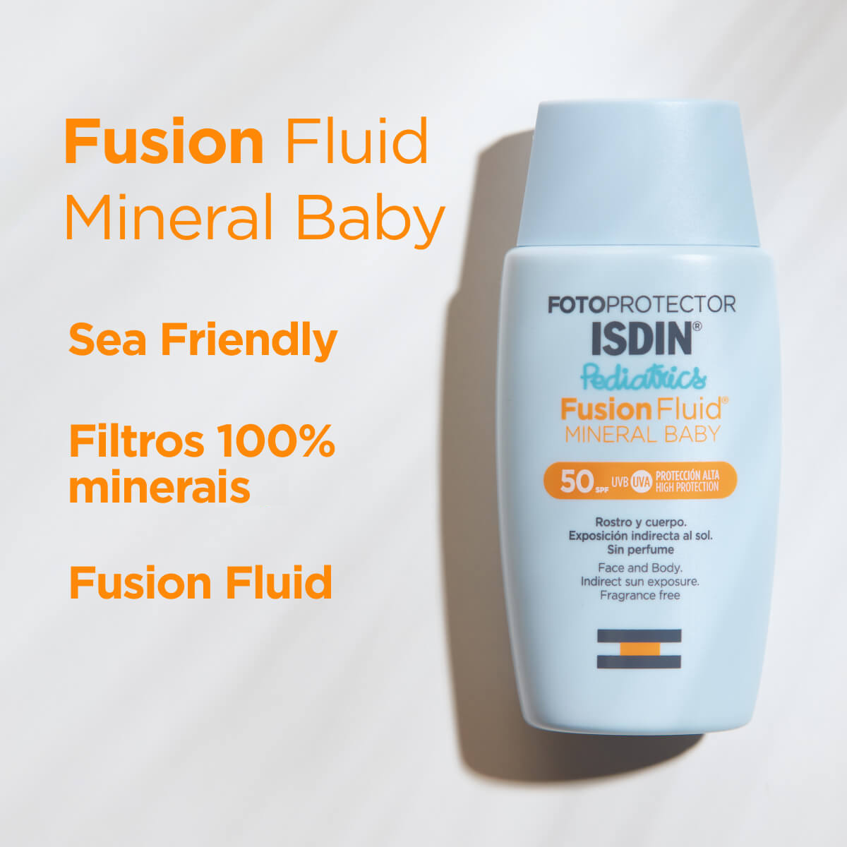 ISDIN Fotoproteção Pediatrics Fusion Fluid Mineral Baby SPF50 é um protetor solar fluído com filtros físicos, especialmente formulado para a pele frágil do bebé.
