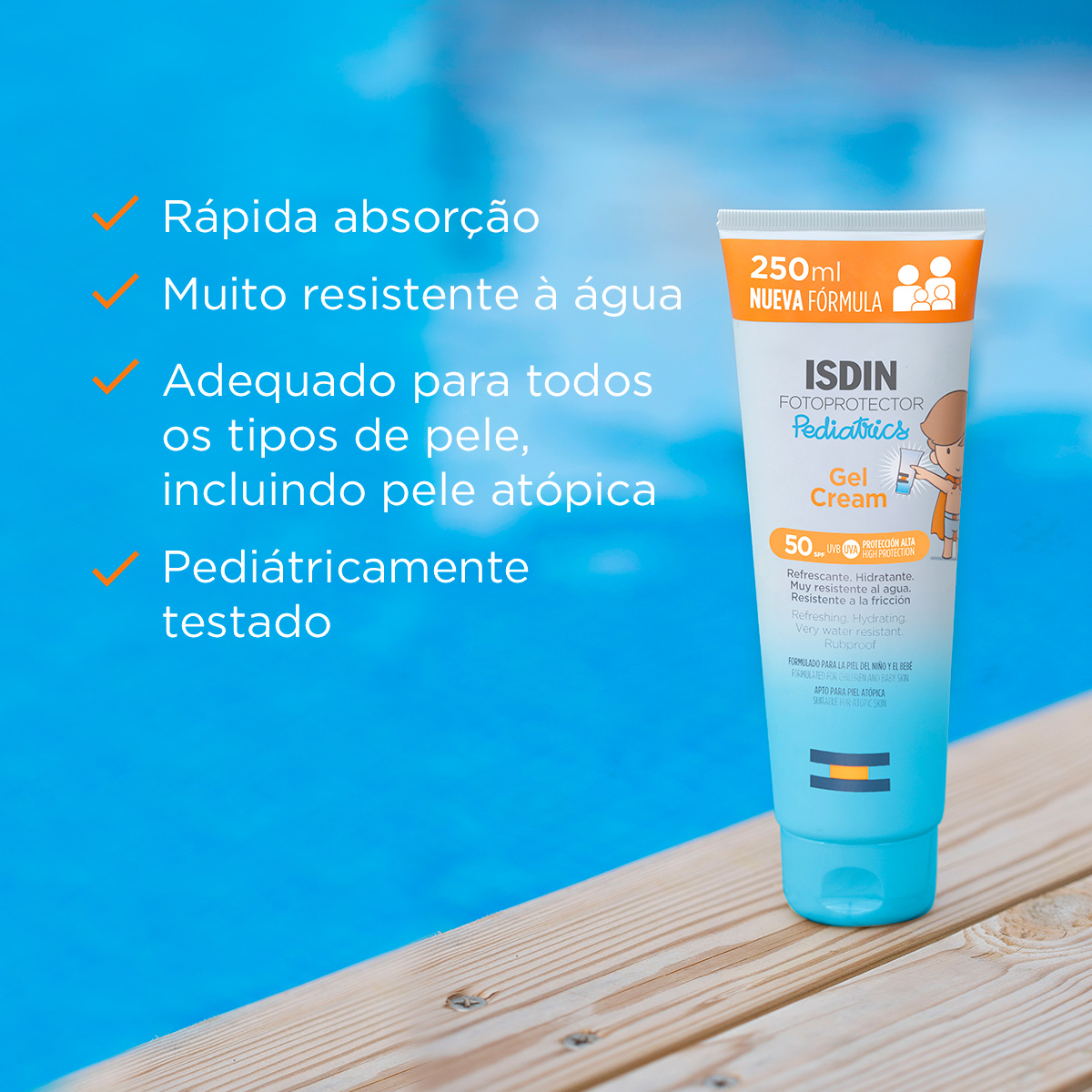 ISDIN Fotoproteção Pediatrics Gel Creme SPF50+ é um protetor gel-creme para o rosto e corpo, que hidrata como um creme e refresca como um gel.
