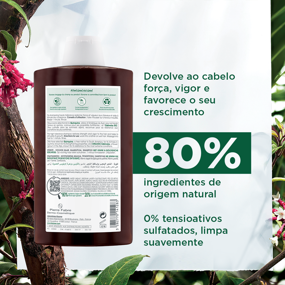 Na sua formulação encontramos vitaminas do complexo B, extratos de Quinquina e Edelvaisse BIO que permitem limpar o cabelo ao mesmo tempo que ajudam a favorecer o seu crescimento.
