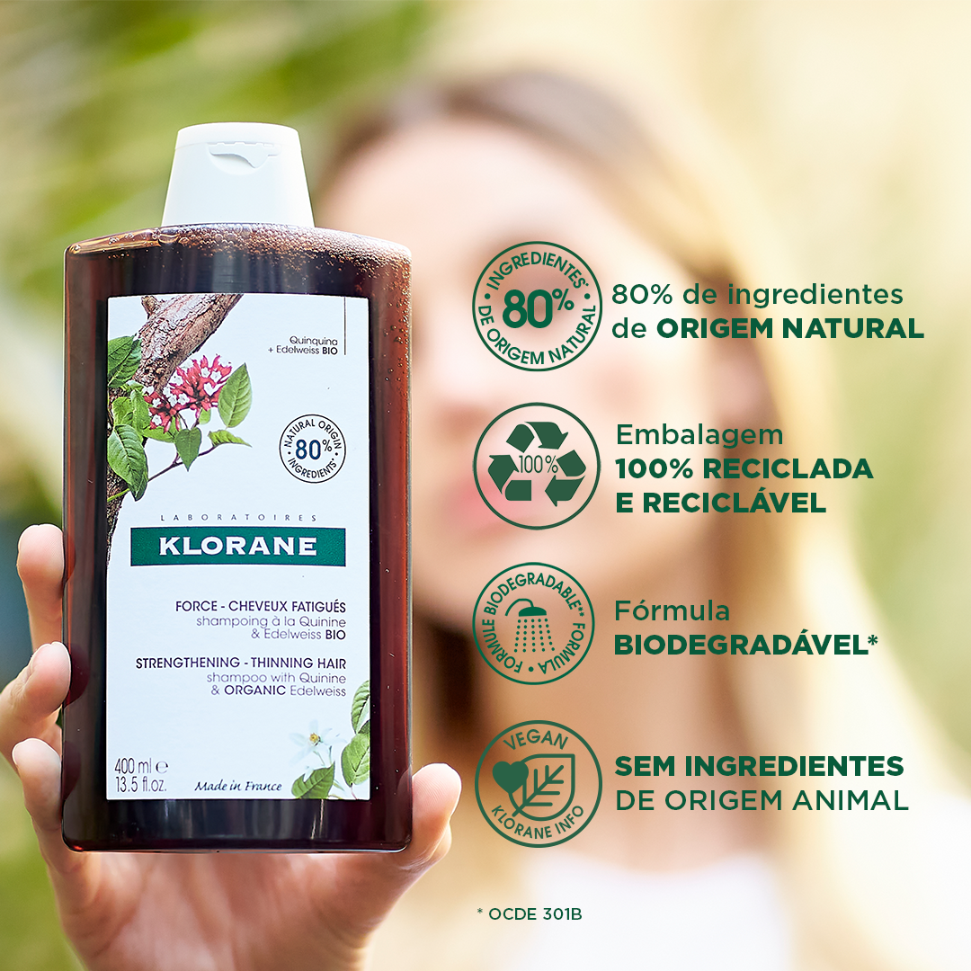 Klorane Capilar Champô Quinina e Edelweiss é um cuidado de higiene capilar estimulante que restabelece a força e a vitalidade do cabelo desvitalizado.