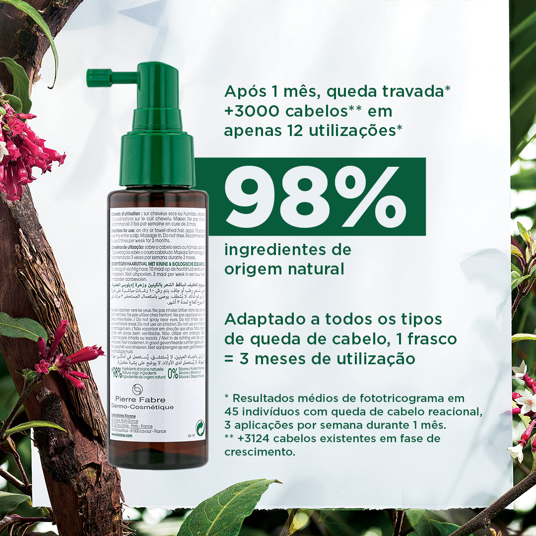 Com um complexo orgânico de Quinina e Edelweiss este sérum permite ao cabelo recuperar a força, diminuindo a sua queda. Sem enxaguar, conseguimos retardar a queda através da quinina, estimular o crescimento através do edleweiss em combinação com manganês. Desta forma, os ciclos capilares ficam regulados e o cabelo fortificado graças, também, a um conjunto de vitaminas do complexo B presentes na formulação.