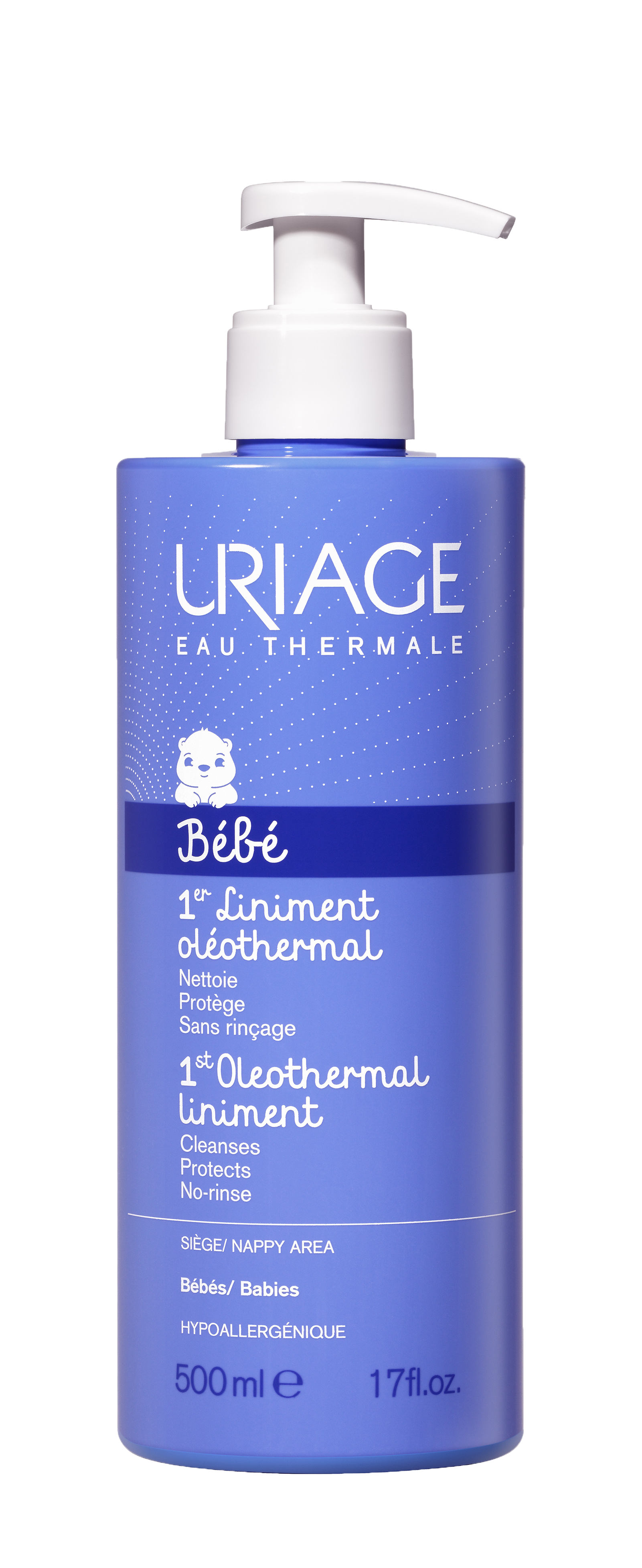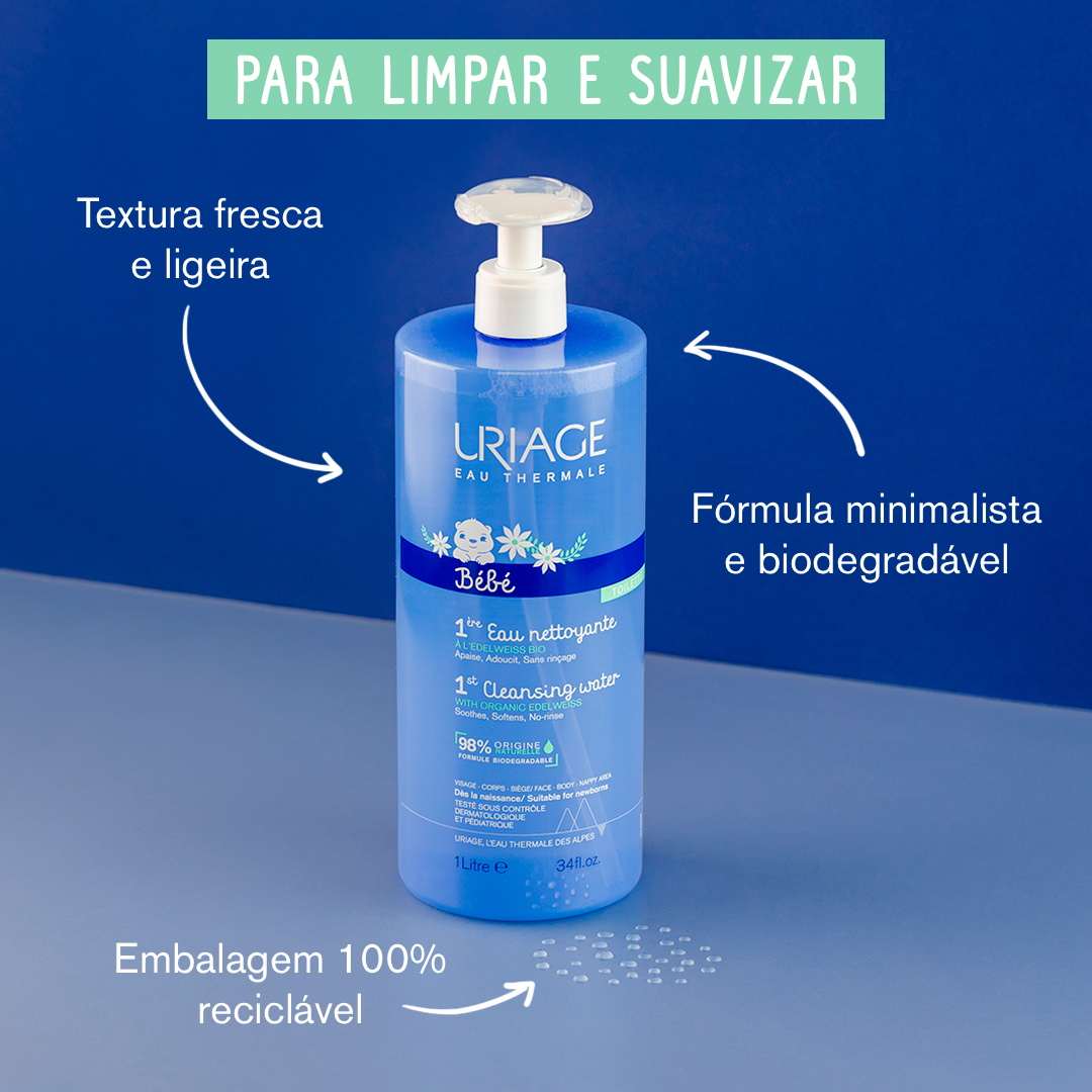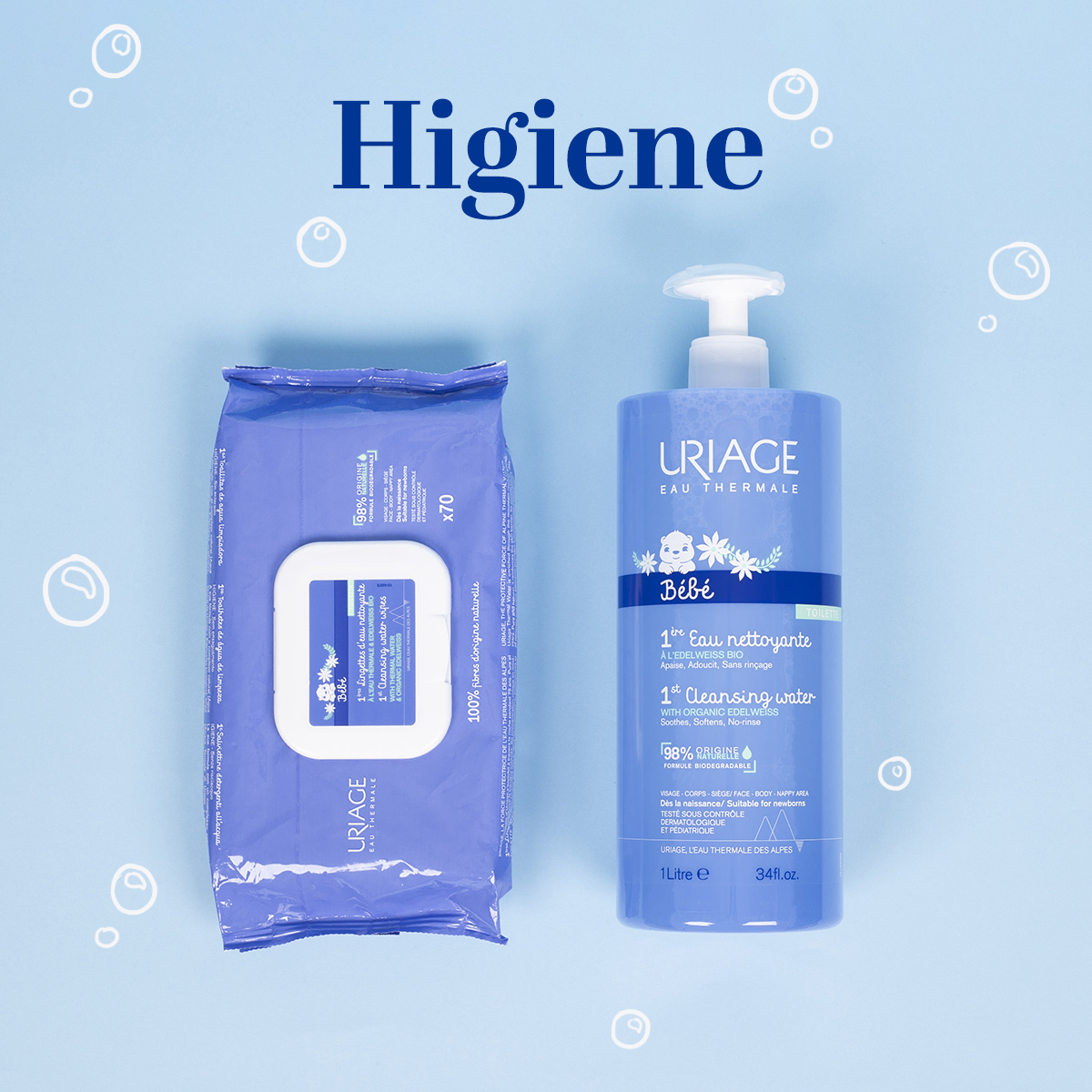 Uriage 1ª Água de Limpeza limpa delicadamente o rosto, corpo e rabinho do bebé.