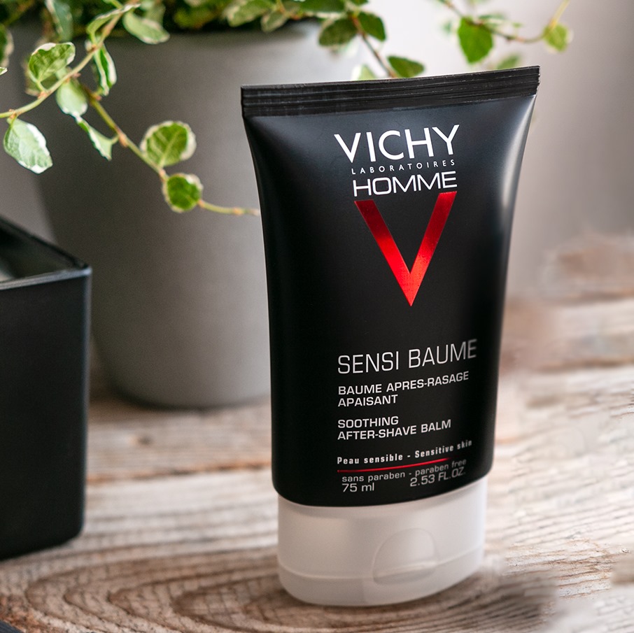 Vichy Homme After-Shave Sensi-Baume indicado para homens de pele sensível que procuram um alívio para o ardor e a irritação do barbear.